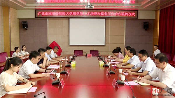 7月19日,广德市举行同安徽师范大学法学院人才培养与就业工作合作签约仪式。安徽师范大学党委副书记、校长张庆亮,广德市领导周其红、储德清、马亮出席签约仪式。