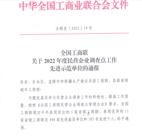 近日,广德市工商联接连获得全国工商联及省工商联表彰!中华全国工商业联合会印发文件,对2022年民营企业调查点工作表现突出的单位给予通报,广德市工商联荣获2022年调查点工作先进基层单位。同时,安徽省工商联发文表彰2022年民营企业调查点工作表现突出的单位和个人,广德市工商联荣获2022年全省民营企业调查点工作县级先进单位;广德市工商联吕齐亚同志荣获2022年全省民营企业调查点工作县级先进个人。