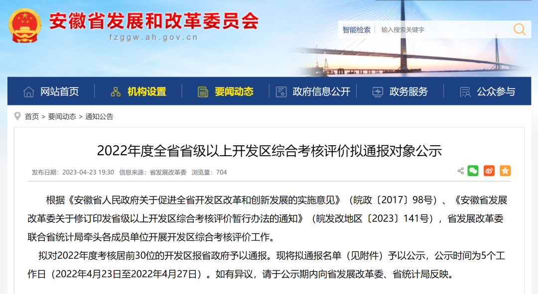 4月23日安徽省发改委发布《2022年度全省省级以上开发区综合考核评价拟通报对象公示》,具体如下。