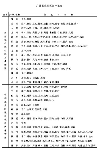 广德在全国综合农业区划的分区中,属于第五大区——长江中下游区的第四亚区,即江南丘陵山地农林区。1981年4月,县农业区划办公室成立。1982年10月,完成了《广德县粗线条综合农业区划报告》。全县分为三大农业区。