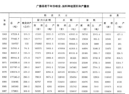 广德以盛产稻谷名著皖南,正常年景,粮食自给有余。但在建国前,由于生产力水平低下,加上封建土地制度的束缚,粮食生产一直上不去。据资料统计。民国22年(1933)全县粮食产量4153.1万公斤。次年,发生大旱,粮食产量剧降,只有上年的26.7% 。建国前几年,粮食产量也只在5000万公斤上下,到1949年,全县耕地为460168亩,农业人口为203442人,粮食产量不足5000万公斤,平均每个农业人口占有粮食234公斤。