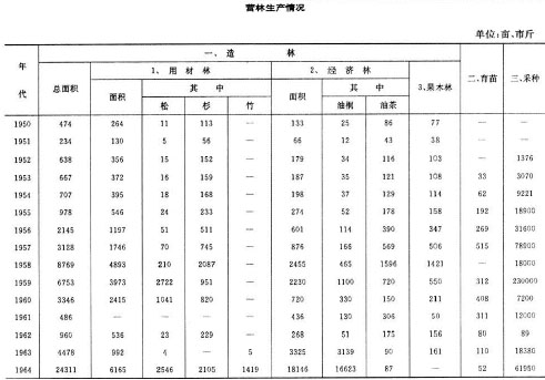 70年代人工营造大面积集中连片的中、幼龄林。针叶树面积较大,而经济林、薪炭林、阔叶树过少,林种、树种结构不合理,有待调整。80年代,随着“谁栽谁有,允许继承”政策的落实,群众在“四旁”(村、宅、路、水旁)、自留山、自留地造林的积极性提高,因地制宜培育“六小园”(林、竹、果、茶、桑、花园)增多。仅造林专业户就种植杉木10794亩,外松1259亩,松树17亩,毛竹27亩,板栗16亩,泡桐22亩。东亭乡施境村实现“人均百棵树,家庭是林场,白天不见村庄,夜晚不见灯光(浓荫郁蔽)”,昔日的“光腚村”,如今满目葱茏。1984年后,随着林业政策的进一步放宽,群众造林积极性高涨,出现了造林专业户、重点户和联合体承包荒山造林的形式。1984年,全县共有造林户103户,贷款39.6万元,承包荒山21842亩。至1985年已造林12135亩,占承包面积55.5%。其中有原县卫生局副局长、离休干部郑立模和妻子王丛芳(供销社退休职工),在东亭乡高峰村承包荒山造林;林业局技干丁嗣久在花鼓乡枫塘村承包荒山造林等,他们为推动荒山承包、绿化家乡起了带头作用。1987年,本县造林专业户增至200余户。