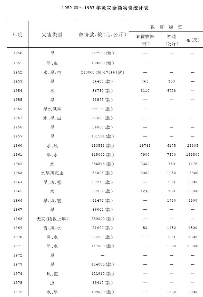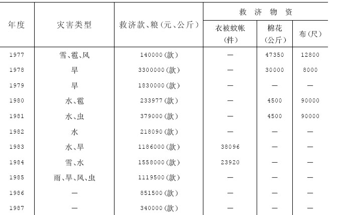 1986年全县有22个乡镇遭受水、旱、风、虫灾害。县政府发放救济款85.15万元,平价供应水泥400吨。1987年全县约有半数乡镇遭受水、风和雹灾。发放救济款34万元,平价供应粮食22.5万斤,化肥990吨,钢材140吨,水泥100吨,煤710吨,木材20立方米。