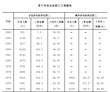 1958年,新建和扩建许多工矿企业,招收了大批新职工,工资比较混乱。次年,对全县企事业单位的工资进行了调整,统一了工资制度,规定了技工、普通工、临时工、勤杂工的工资标准以及学徒工和试用人员的待遇。