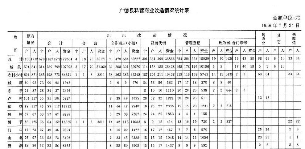 1954年10月,县人民政府成立专门机构,采取合营、合作、经销、代销等形式,对本县私营商业进行社会主义改造。1956年7月,商业私改工作基本完成,共组织改造私商1288户,1685人;未进行改造的33户,34人,仍从事个体经营。