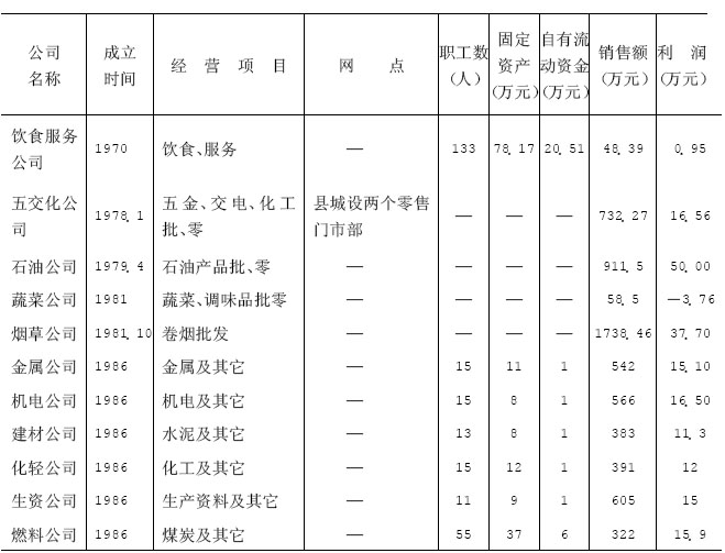 1987年,全县有国营商业机构172个,人员1927人。其中隶属商业局系统的百货、五交化、盐业、食品、蔬菜、石油、糖酒、饮食8个公司,拥有国家流动资金112.8万元,企业流动资金10.1万元,固定资产335.6万元,仓库7209m2,营业用房13497m2,冷库容量120吨,酒池、酒罐储量100m3,油库(罐)容量2469m3,运输汽车17辆,职工宿舍13754m2。是年,国营商业零售总额3801万元,占全县社会商品零售总额的20.7%。