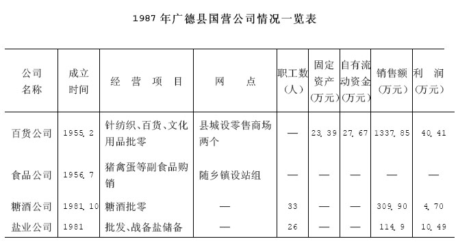 1950年3月15日,国营皖南贸易公司广德第三支店建立,下半年该店改为中国粮食公司广德办事处,专营粮食。同时,又建立广德专卖事业管理处,经营烟酒。1951年6月,成立中国土产公司广德办事处,1955年2月该办事处撤销,同时成立广德百货公司和广德花纱布公司。3月,成立广德盐 业公司。1956年,先后成立食品公司、文化用品公司经营处、医药经营处、农产品采购局。上述国营商业机构,随着隶属关系的改变、曾经撤并或易名。1957年11月,广德县商业局成立。同年,广德国营商业企业有百货、花纱布、文化用品、食品、医药等6个专业公司(经营处)及农产品采购局。1958年5月,国营商业与供销社合作商业合并,实行政企合一,撤销专业公司,设立农副产品采购、生产资料、工业品、食品等4个经理部,农村基层商业机构统一改为国营商店。1962年,国合商业分家后,国营商业仍以批发为主兼营县城零售业务,下设百货、食品、石油煤建、糖业烟酒、盐业、饮食服务、药材等7个公司,5个食品站,9个烟酒分销处。1970年,国营商业再度合并,设立百货、糖业烟酒、盐业、食品、药材、土产、农业生产资料、饮食服务8个公司,下辖19个基层供销社,3个中转站,2个食品站。1977年,国合商业再次分开后,国营商业加强了专业化经营。1978年至1984年先后保留或分设了百货、五交化、燃料、石油、烟草、糖酒、蔬菜、盐业、食品、饮服、经贸、药材、砂石、外贸、竹木等15个公司,1986年3月又成立了金属、机电、建材、化轻、生资等公司。