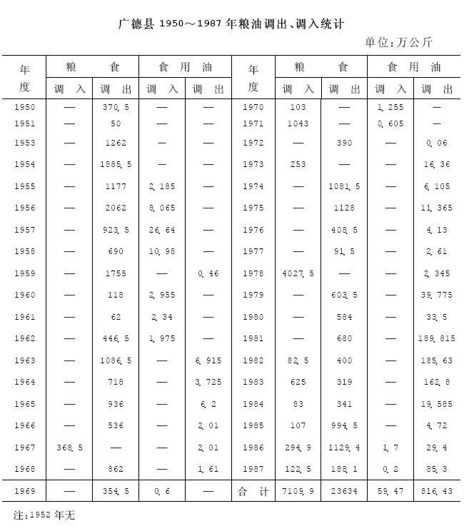 建国初,县粮食部门收购的粮油,大部分按照国家计划调往外地。60年代起,采用就仓直拨的办法。邱村、高湖、赵村、流洞、彭村、东亭等地粮油就地加工,直调邻省宜兴、溧阳、长兴等县;誓节、花鼓、杨杆、城关粮油运入本省宣城、芜湖;卢村、柏垫、山北、下寺、新杭、桃山、梨山、同溪、月湾、杨滩粮油留作库存,供应山区;城郊一带拨直属库加工,供应城镇和外调湖州、杭州、无锡、上海等地。1950~1987年,共调出粮食23634万公斤,油脂816.43万公斤,减除调入粮食7109.9万公斤,油脂59.47万公斤,净调出粮食16524.1万公斤,油脂756.96万公斤。