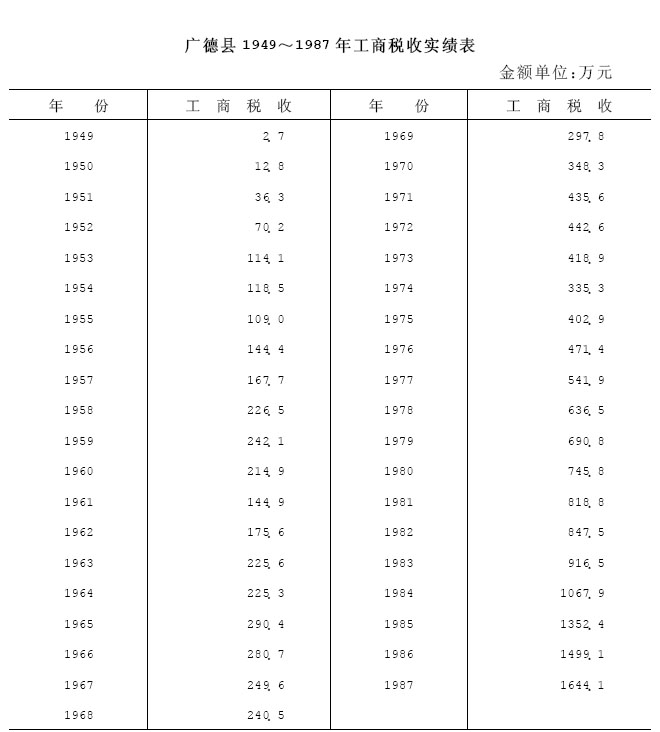 1958年,改革工商税制。将商品流通税、货物税、营业税、印花税合并为工商统一税;将工商业税中所得税,改为独立的工商所得税,并简化征收办法;在基本保持原税负的基础上,对税率进行了部分调整。1959年,停征利息所得税。1962年,开征集市交易税。1966年,停征集市交易税和文化娱乐税。税制改革后,广德开征的税种仅有工商统一税、工商所得税和屠宰税3种。