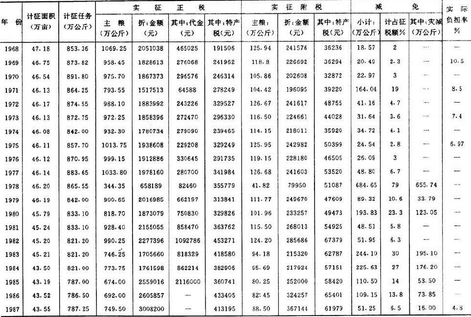 建国以后,本县严格执行农业轻税及依法征收,依法减免的方针政策。在农业税的减免方面,主要有社会减免、灾情减免和政策性优待减免3种。社会减免,即对国营、集体单位和农户的照顾减免;灾情减免,是对因遭受自然灾害而歉收的单位和农户的减免;政策性优待减免,是指国家为推行某种政策而给以的优待性质的减免,如开垦荒山、荒地给予定期减免,对知识青年上山下乡办的农场的减免等。此外,对农业收入较少、口粮水平较低的集体单位和农户,曾有过低于起征点免征的规定。上述政策执行至今无重大变化,只是在减免对象、项目以及灾情减免起减点和减免成数上,曾有过修订。具体做法每年发布的征收农业税的通知中均有详细规定。本县1950~1987年共减免农业税5924.5万公斤,占农业税征收总额33242.45万公斤的8.67%。本县农业税实际负担逐年降低,1987年为4.8%,比1952年降低了九点二个百分点。
