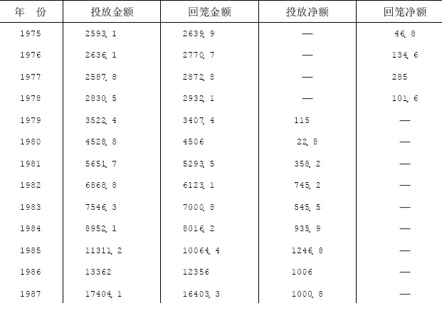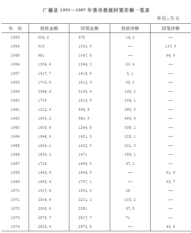 1953年至1987年,全县投放总额为127026.4万元,回笼总额为119440.7万元,净投放7585.7万元。其中有26年为投放年,累计净投放8582.6万元;有9年为回笼年,累计净回笼996.9万元。1985至1987年每年净投放额均超过1000万元。