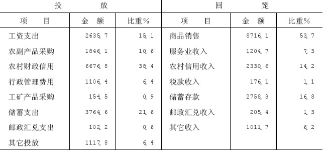 货币投放渠道主要是工资性投放、农副产品采购、农村财政信用,其次为行政管理费用、储蓄存款支出、工矿产品采购等。回笼则大多为商品销售收入,其次是农村财政信用和城镇储蓄收入等。1987年广德现金投放回笼情况见下表: