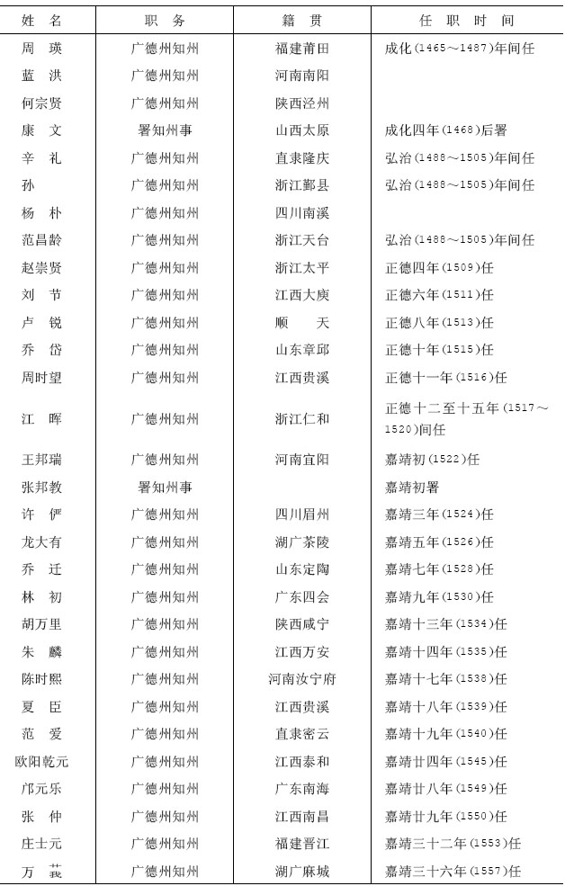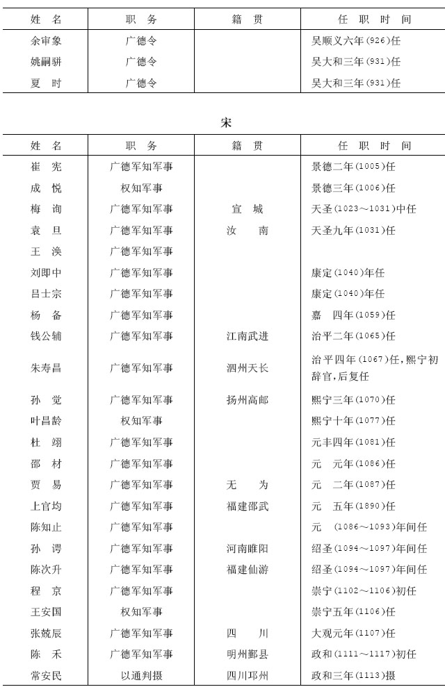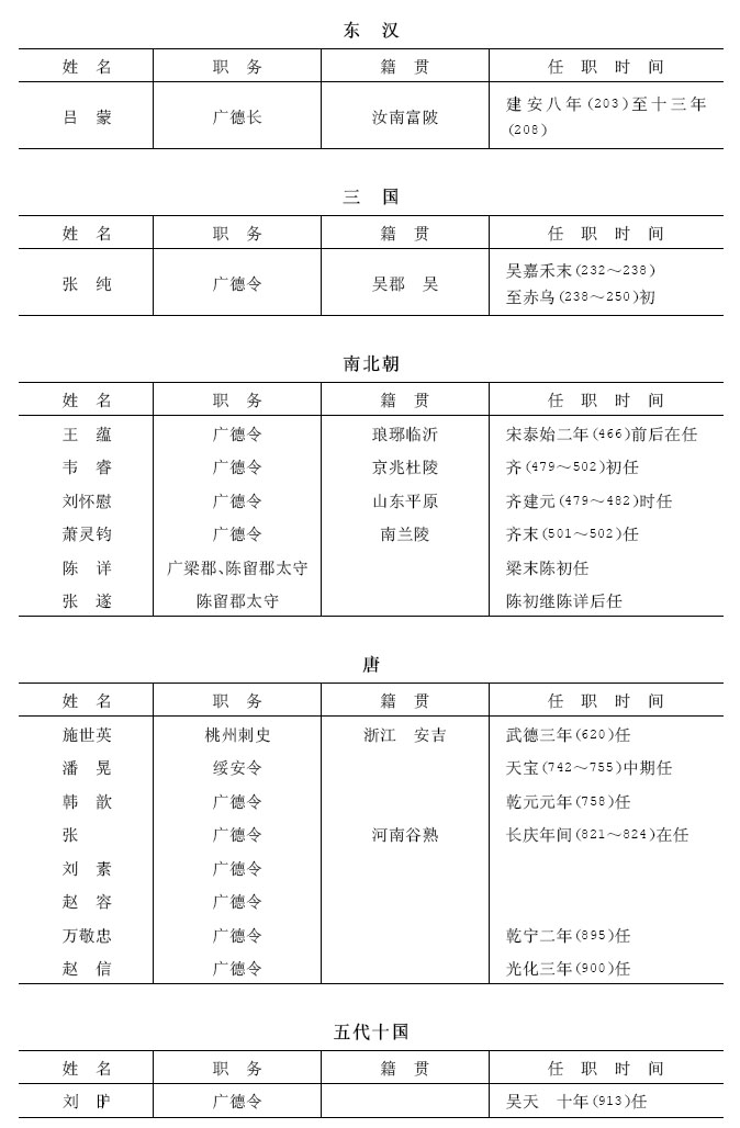 东汉建安初,孙吴析故鄣置广德县,吕蒙“拜平北都尉领广德长”。嘉禾末(238)改设县令。此后广德曾先后为县、为郡、为州、为军、为路、为府,名称也亦屡有更易。其间,旧志仅有少数行政职官的记载,内设机构和人员亦多不详。