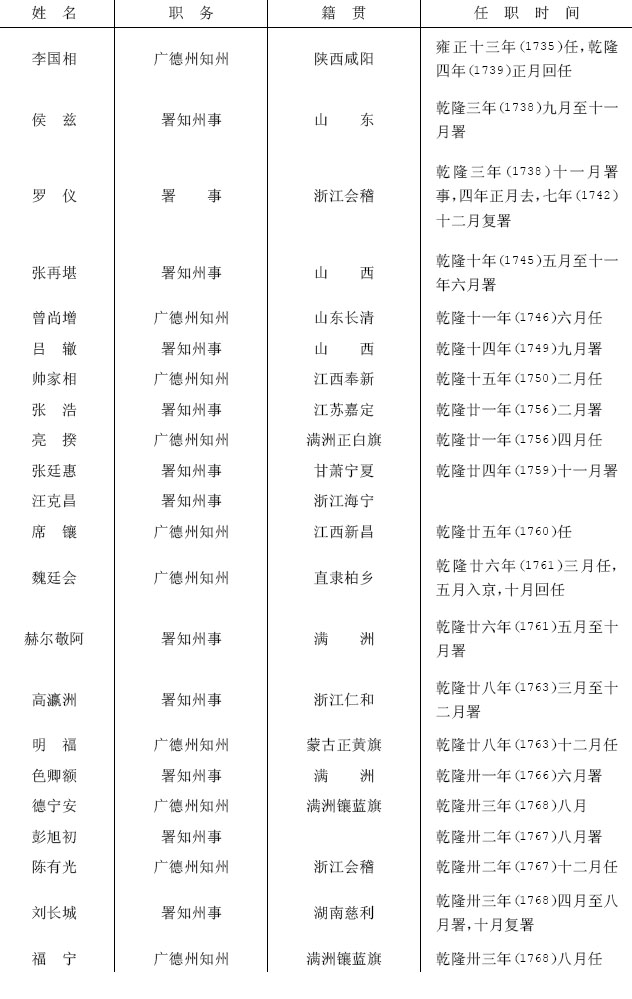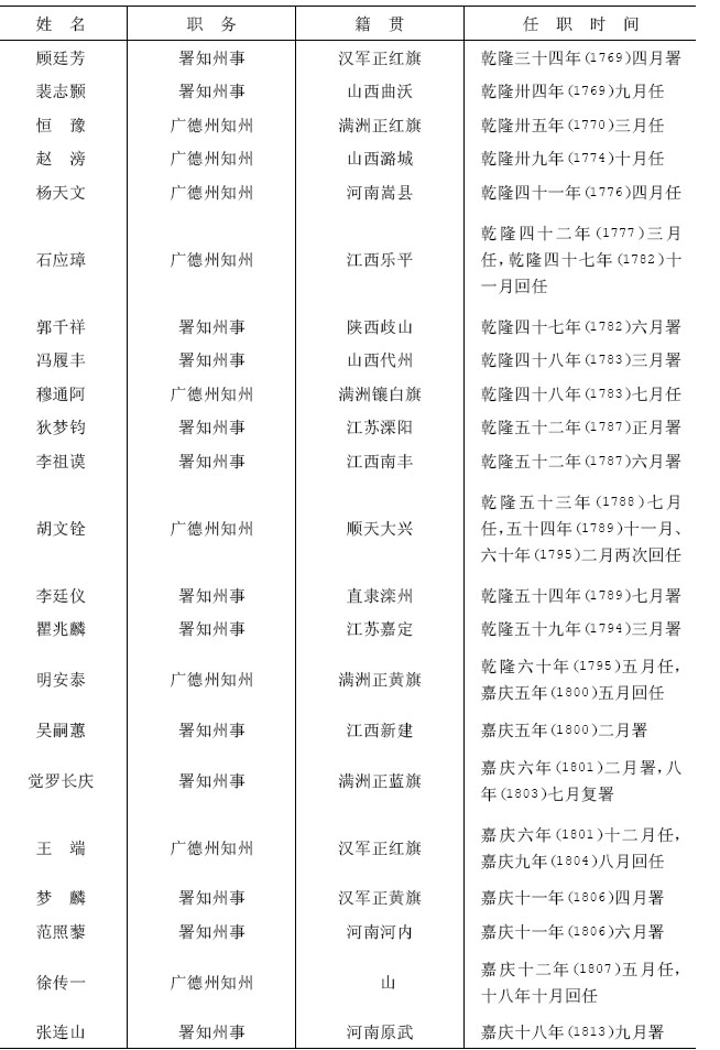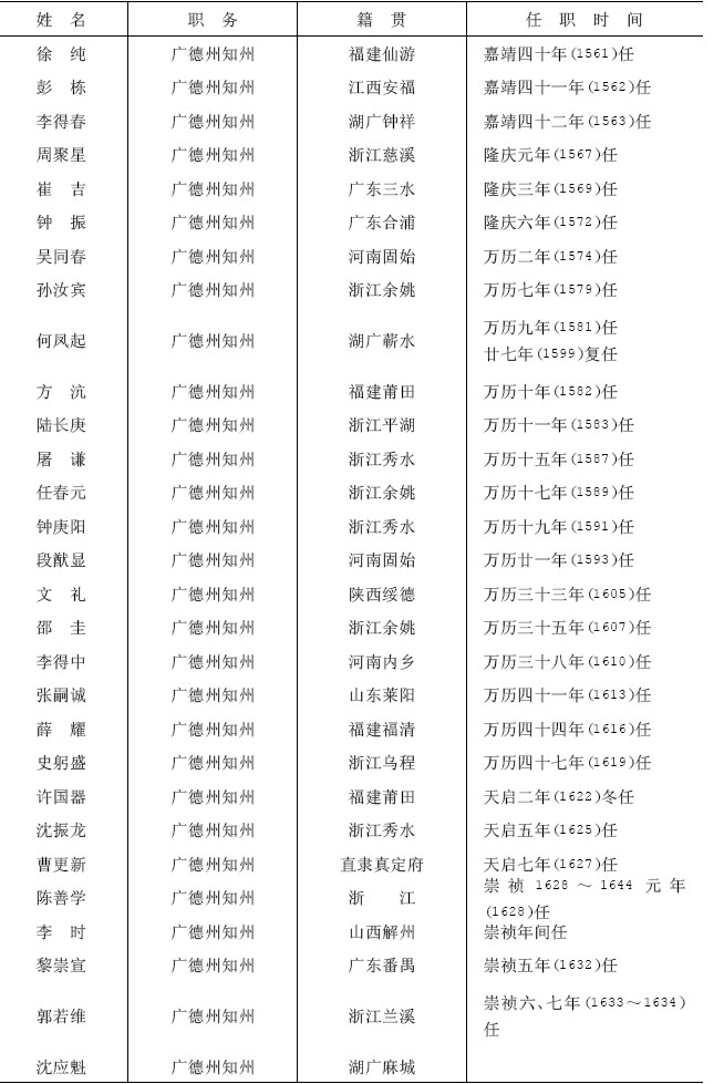 清沿明制,唯判官、训导均为1员。康熙初(约1661)裁同知。乾隆三十四年(1769)载陈阳巡检司,原辖区划归杭村、广安两巡检司。
