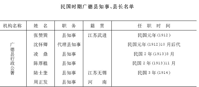 民国16年3月,北伐军到广德,改县行政公署为县政府,县知事为县长。