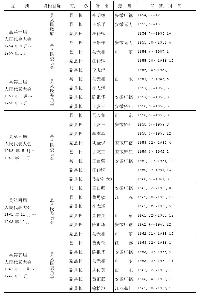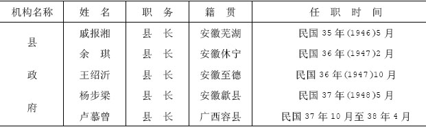 民国35年,县政府恢复民政、财政、教育、建设、军事、社会6个科,秘书、会计、合作、统计、人事5个室和警察局。