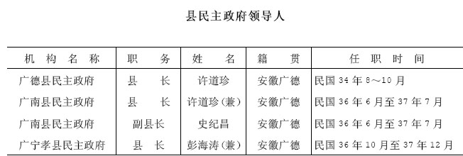 民国34年(1945)8月28日,新四军苏浙军区部队光复广德县城,广北、广南两县抗日民主政府迁住县城,合并成立广德县民主政府,许道珍任县长,原辖区乡不变。隶属苏南行署第二行政分署。9月底,广德县民主政府随新四军北撤后自行消失。