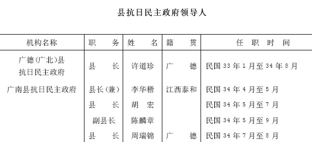 民国32年(1943)5月,新四军第十六旅进驻广郎地区开展敌后游击战争,建立抗日根据地。次年1月,广德县抗日民主政府在杭村水东介山成立,县长许道珍。政府内设财经科、财税科、军事科等,下辖一、二、三3个区及杭村、开化、松墩、路南、东亭、山北、砖桥、门口、西湖、白水、高湖、新桥、沈村、花鼓、凤井、苏村等乡抗日民主政府。隶属苏南行署第四分区,34年2月,改属苏南行署第二行政分区领导。民国34年2月,为贯彻中共中央“扩大解放区,缩小沦陷区”的方针,抗日根据地由广北向广南发展。4月,广南县抗日民主政府在同溪陈坞村成立(原广德县抗日民主政府改名为广北县抗日民主政府),县长由中共广南县委书记李华楷兼任,下辖卢村、柏垫、苏村3个区和卢村、笄山、石峻、同安、柏垫、松花、桐氵内、月湾、遐嵩、夏村、独树、杨杆、戈村、七塌及由广北县划入的东亭、凤井、苏村、花鼓等乡抗日民主政府,隶属浙西天(目山)北行署。
