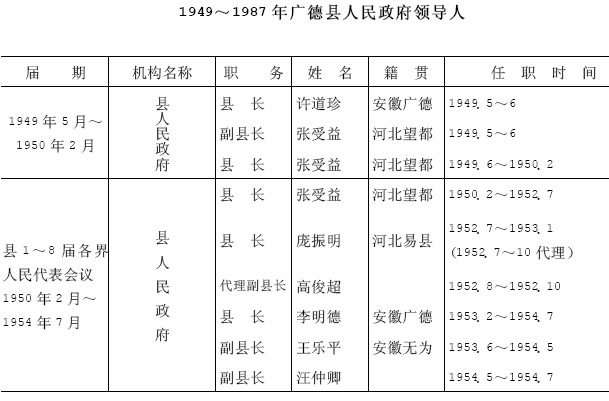 1949年4月26日,广德县解放,在广德坚持敌后斗争的同志,接管了县政权,打出了广德县民主政府的牌子,作为临时领导机构。5月9日,正式成立广德县人民政府,许道珍任县长。1955年10月,县人民政府改称县人民委员会。1966年上半年,“文化大革命”开始,县人民委员会工作被迫停顿。1967年3月,县人民武装部主持组建了广德县抓革命促生产第一线指挥部(成立初为抓革命促生产领导小组),行使县人民委员会部分职权。1968年8月18日,广德县革命委员会成立。1981年2月,召开县第八届人民代表大会后,改县革命委员会为县人民政府。