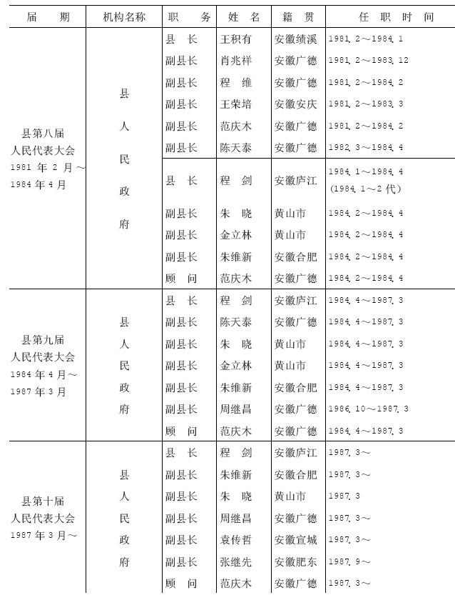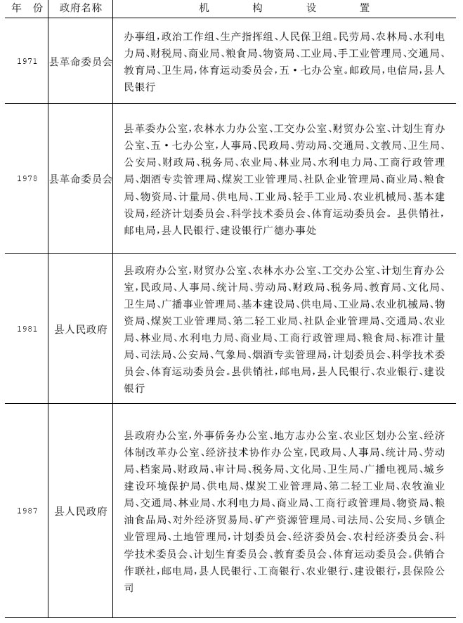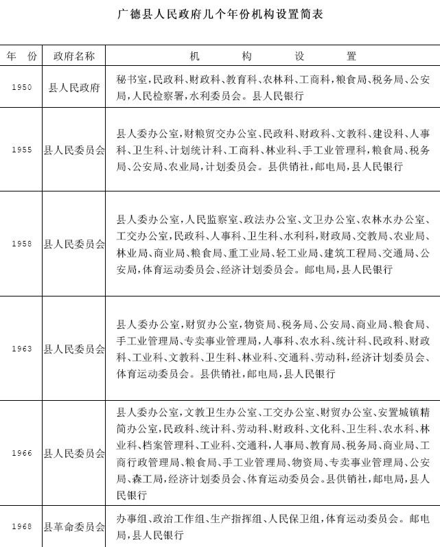 1949年5月,广德县人民政府成立后,至1951年底,县行政机构仅设秘书室、人民检察署、水利委员会、财经委员会和公安、粮食、税务3个局,以及民政、财政、教育、工商、人事、农税、建设、卫生等8个科。此后,县行政机构根据各时期的工作需要,设、并、撤频繁。“文化大革命”开始后,政府工作机构瘫痪。1967年3月,县人武部主持成立“抓革命促生产第一线指挥部”,下设办公室、农林组、工交组、财贸组、政工组、文卫组,领导全县革命和生产工作。1968年8月,县革命委员成立,下设政工、办事、生产指挥、人民保卫4个组,替代原县人委各工作机构。同年10月,学习河南灵宝县经验,“同类合并,政企合一”的精兵简政经验,1969年元月成立毛泽东思想宣传社、工业管理社、人民财政管理社、粮油棉购销管理社、人民生活服务社、生产资料服务社、农林水机电管理社和交通管理站,同时保留分别于1968年8月、12月成立的供销合作社和人民卫生社。1970年11月撤9社1站后,各工作机构逐步恢复和建立,并增设了一些新的工作机构。1981年2月,恢复县人民政府时,设机构43个,至1987年底增至49个。