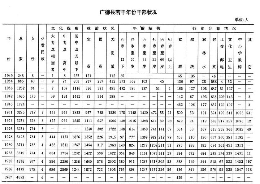 1978年以后,重视对干部的革命化、年轻化、知识化、专业化的建设,干部队伍素质明显提高,干部队伍结构有了较大改善。1986年,全县干部中,具有大专以上文化程度的占15.2%,中专及高中的占57.1%,初中以下占27.7%;25岁以下的占17.7%,26岁至35岁的占19.9%,36岁至45岁的占27.7%,46岁至55岁的占28.4%,56岁以上的占6.3%;女性占21.7%。1987年全县共有干部4653人,其中各类专业技术人员(含中、小学教师)占55.2%。