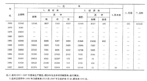 70年代人工营造大面积集中连片的中、幼龄林。针叶树面积较大,而经济林、薪炭林、阔叶树过少,林种、树种结构不合理,有待调整。80年代,随着“谁栽谁有,允许继承”政策的落实,群众在“四旁”(村、宅、路、水旁)、自留山、自留地造林的积极性提高,因地制宜培育“六小园”(林、竹、果、茶、桑、花园)增多。仅造林专业户就种植杉木10794亩,外松1259亩,松树17亩,毛竹27亩,板栗16亩,泡桐22亩。东亭乡施境村实现“人均百棵树,家庭是林场,白天不见村庄,夜晚不见灯光(浓荫郁蔽)”,昔日的“光腚村”,如今满目葱茏。1984年后,随着林业政策的进一步放宽,群众造林积极性高涨,出现了造林专业户、重点户和联合体承包荒山造林的形式。1984年,全县共有造林户103户,贷款39.6万元,承包荒山21842亩。至1985年已造林12135亩,占承包面积55.5%。其中有原县卫生局副局长、离休干部郑立模和妻子王丛芳(供销社退休职工),在东亭乡高峰村承包荒山造林;林业局技干丁嗣久在花鼓乡枫塘村承包荒山造林等,他们为推动荒山承包、绿化家乡起了带头作用。1987年,本县造林专业户增至200余户。