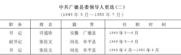 1949年4月26日,广德县解放。5月9日,中共皖南区党委任命许道珍等9人组成中共广德县委员会,许道珍任书记,张佐文为副书记。“文化大革命”初期,全县党组织基本停止活动。1969年4月,成立中共广德县革命委员会党的核心小组。1970年12月恢复中共广德县委。