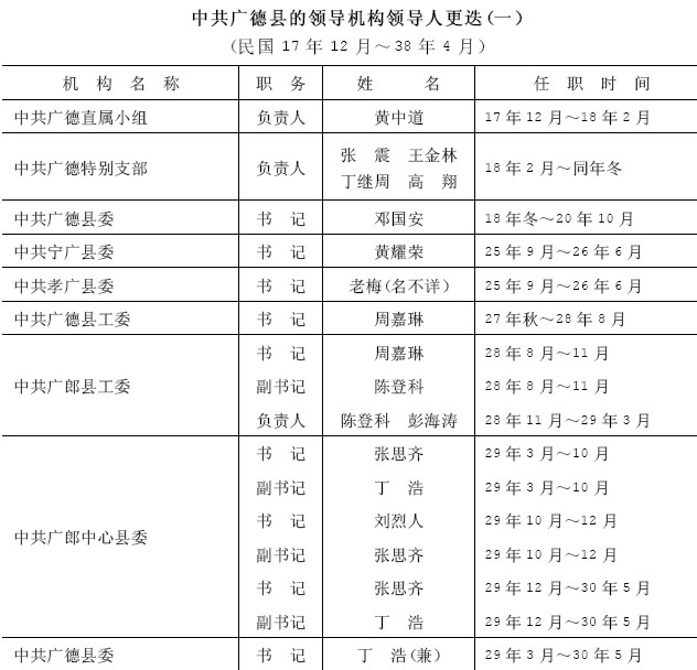 民国17年(1928)12月中共广德直属小组诞生至广德解放,因处于战争环境,斗争异常艰苦复杂,故本县中共党的基层组织和党员人数无系统资料可考,有关人员提供的零星资料,经考证后即如前述。