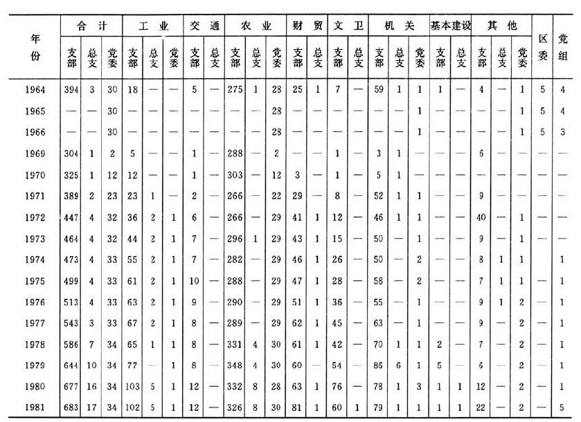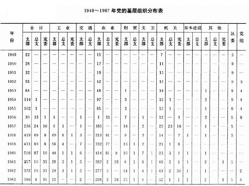 1949年至1964年,全县党员和党组织有很大发展,党员由358名增至4898名,党支部由22个发展到394个,建立4个党组、5个区委、30个基层党委。