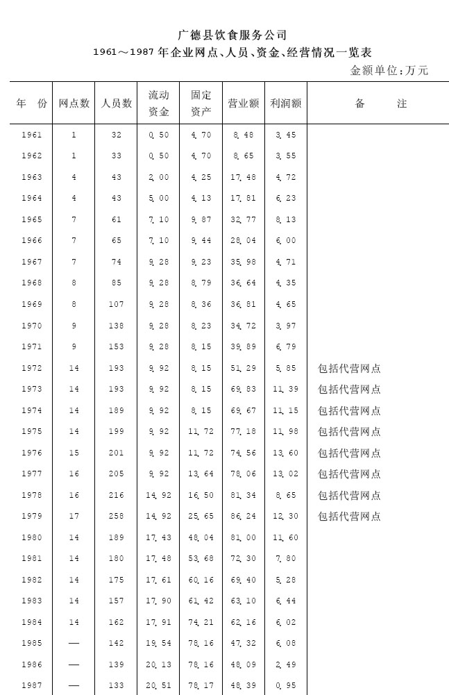 1970年,饮服经理部改为县饮食服务公司。1977年,南门浴池翻建后,开设新长征点心店和女浴池(兼营茶水)。1980年投资12万元,面积2380m2的4层建筑——广德饭店建成开业,设有床位130余张。不久,该店和桃州旅社合建了面积800m2的两层楼房。楼上会议室,可供百人会议使用,楼下餐厅,可供320人同时用餐。