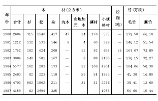 1953年6月以前,木竹及其产品均由私人经营。7月起,由林业部门收购。50年代,平均年收购木材8707立方米,60年代年均收购6650立方米,70年代年均收购5648立方米,1980~1987年年均3207立方米。从1953年起至1987年止,全县共收购木材203273立方米,平均年收购5807立方米。
