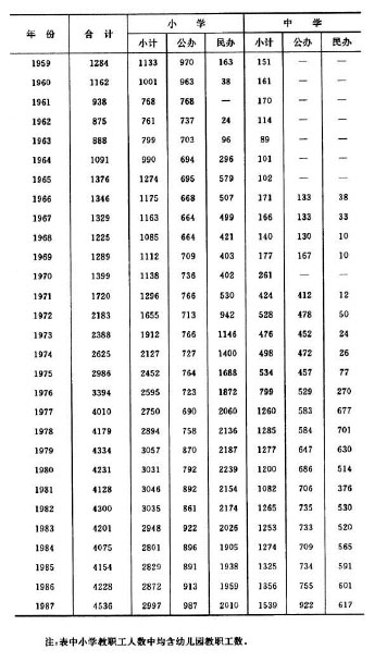 “文化大革命”期间,中学下迁分点办学,小学下放大队管理,发展社办中学,又大量吸收民办教师。1976年全县中小学3394名教职工中,有民办教师2142名,占全县教职工总数的63%。1978年、1979年、1987年曾3次通过考核考试进行整顿,对不称职的民师予以辞退或建议社队另作安排。同时将一批优秀的民办教师转为公办教师。1987年全县共有中小学教职工4536人,其中民办2627人,民办教职工占全县教职工总数的比例降至57.9%。